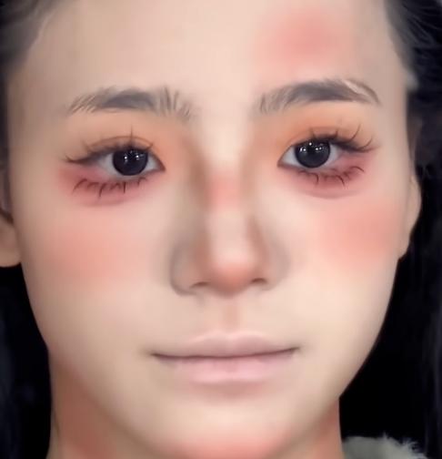 然后这张刮完大白的脸,又被打上厚厚的阴影,画上一层一层的眼妆,直到把整个脸通过一块一块黑糊糊的修容给修建的立体有轮廓。