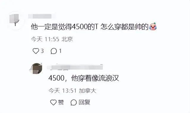 还有的网友说:" 他一定觉得 4500 的 T 恤,怎么穿都是帅的,可实际上他看着真的很像流浪汉。"