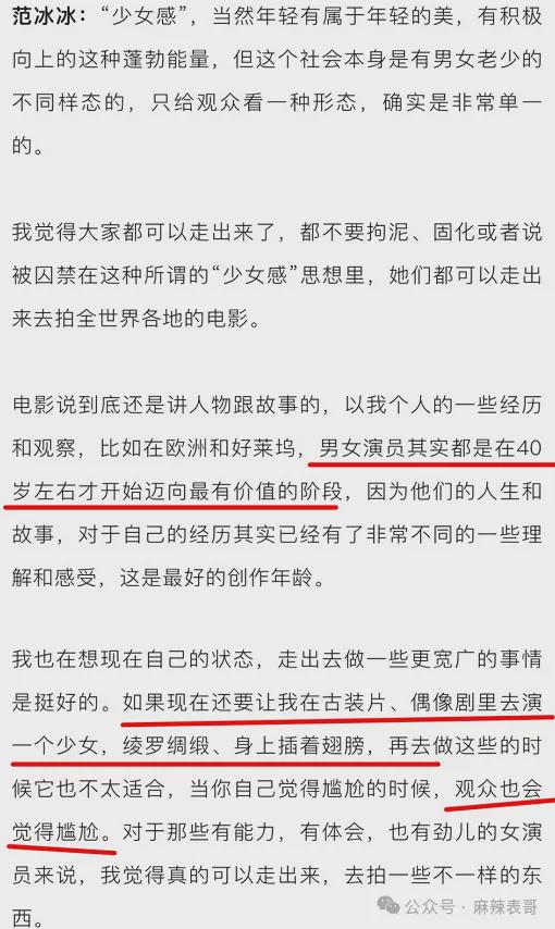 范冰冰说:如果现在还要让我在古装片、偶像剧里去演一个少女,绫罗绸缎、身上插着翅膀,我自己尴尬,观众也会尴尬。
