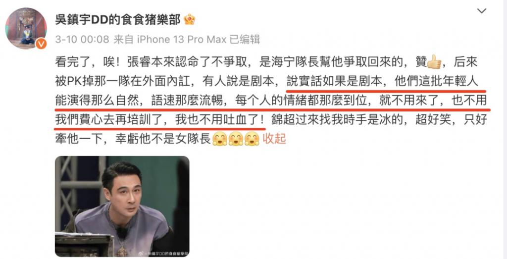 因为后续走向实在太过抓马,以至于有的观众说,可能真人秀部分才是演技大赏。逼得吴镇宇亲自下场辟谣:" 说实话如果是剧本,就不用我们费心去培训,我也不用吐血了。"