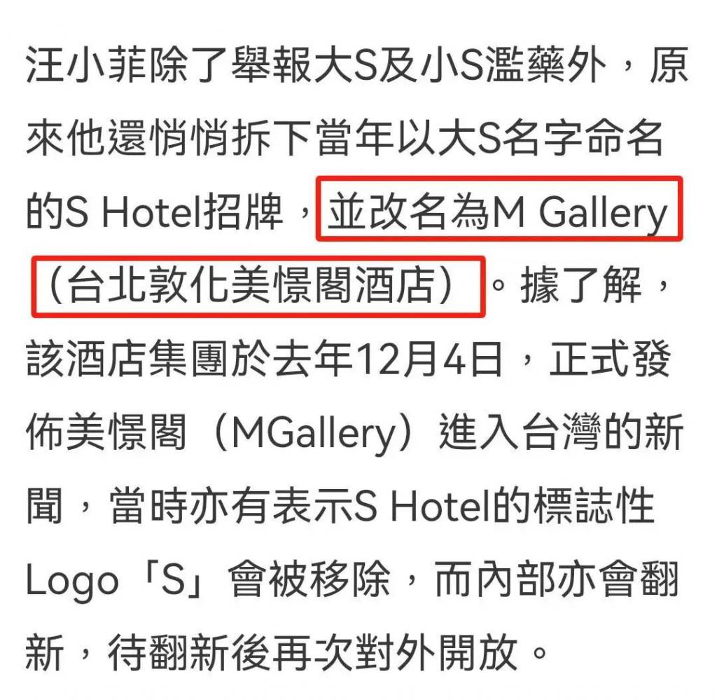 从汪小菲离婚开始,他就一直说要把 S hotel 的名字改掉,之前还传出过他要把酒店名字改成 " 菲行商旅 " 的传闻。但最后定下来的名字是 " 美憬阁 ",听起来十分雅致,但这酒店还有一个新的英文名字 "M Gallery"。