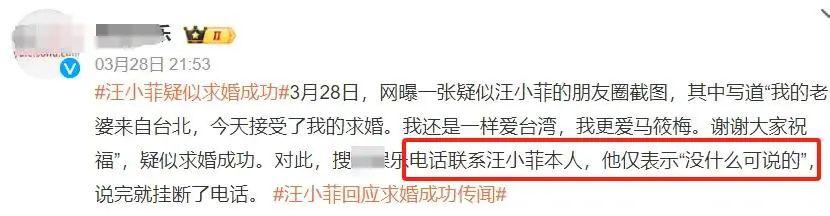 汪小菲这段时间虽然和大 S 打得不可开交,但是他在台湾省也没闲着,甚至一度传出他要在台北买房,定居台湾省和家人、女友一起生活。如今他求婚成功,有媒体联系他,他回应表示 " 没什么好说的 ",也一直没有正式发文官宣,似乎想要保护未婚妻低调行事。跟之前和张颖颖合拍视频高调示爱的做法大相径庭,汪小菲可能也是吃到了教训,不想让网友打扰女方的生活,看来这次或许是真爱了?