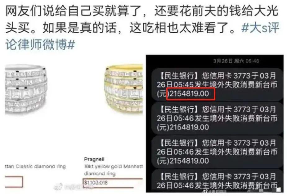 对比大 S 二婚的时候,头纱刷汪小菲的卡,想买的钻戒刷了多次卡都没有买成,后来去纹了一个。据悉大 S 想买的那款钻戒价格才是汪小菲求婚钻戒的三分之一。