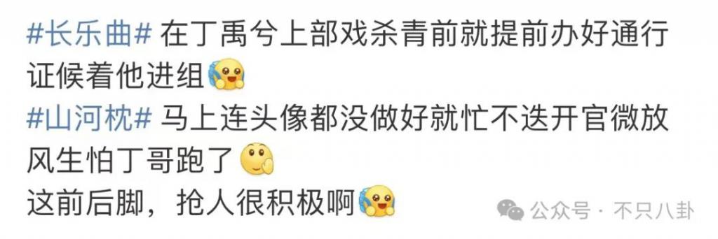 至于为什么会有 " 轧戏 " 的争议传出?粉丝表示:只能说丁禹兮资源太好,无缝进组,招人嫉妒咯。