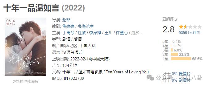 作为一番男主,搭档任敏主演的爱情电影《十年一品温如言》, 创下了豆瓣 2.8 分的低分记录," 好于 0% 的爱情片 " 过于刺眼。