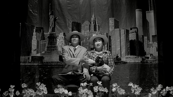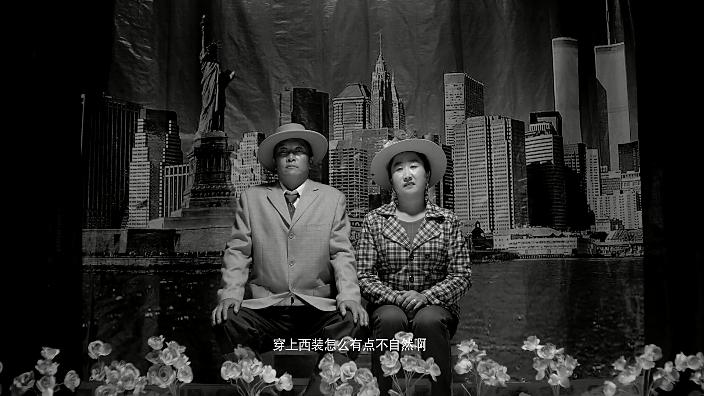 在照相馆里,穿着西装,坐在纽约自由女神背景布前拍结婚照的新人,一脸尴尬与不自然。