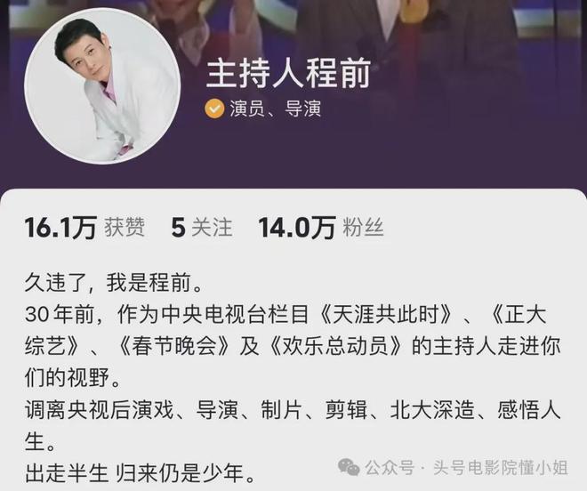 在他社交账号的简介上,他写道:调离央视后演戏、导演、制片、剪辑,北大深造、感悟人生。
