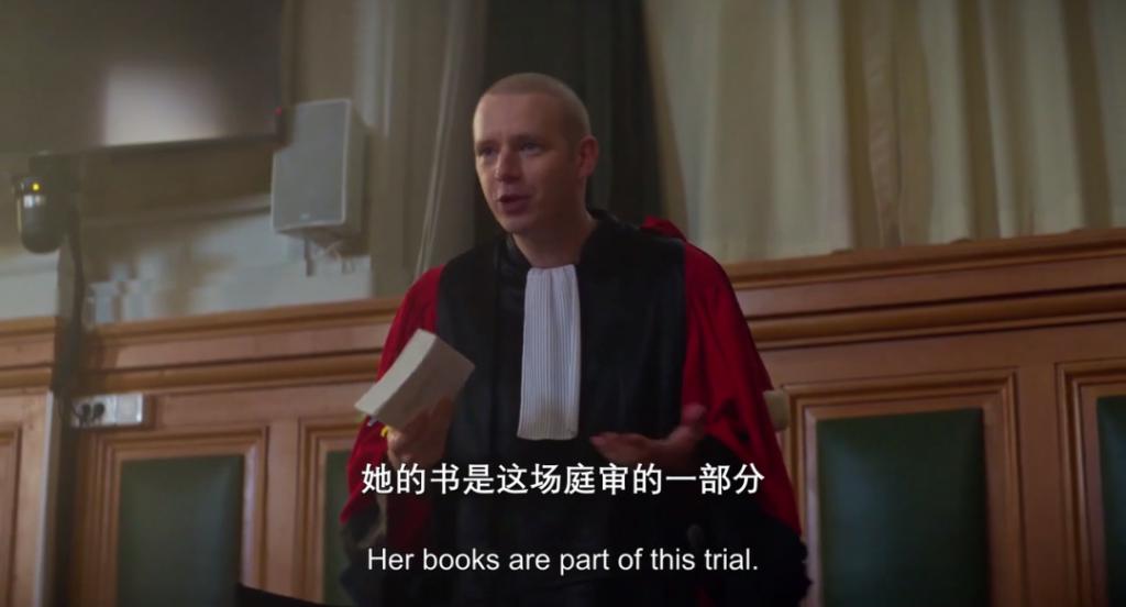 检察官在法庭上朗读桑德拉小说中的文字,试图以小说中的情节来说明桑德拉在现实生活中对丈夫不满,进而杀害丈夫的情节。