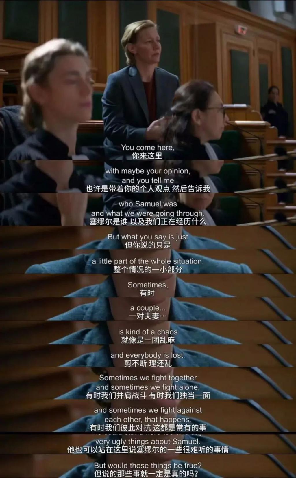 影片最后,桑德拉怅然若失,因为即便获胜,她的生活也已经在审判式的剖析中支离破碎,即便她对塞缪尔曾有爱的成分,如今也依旧随风远去。
