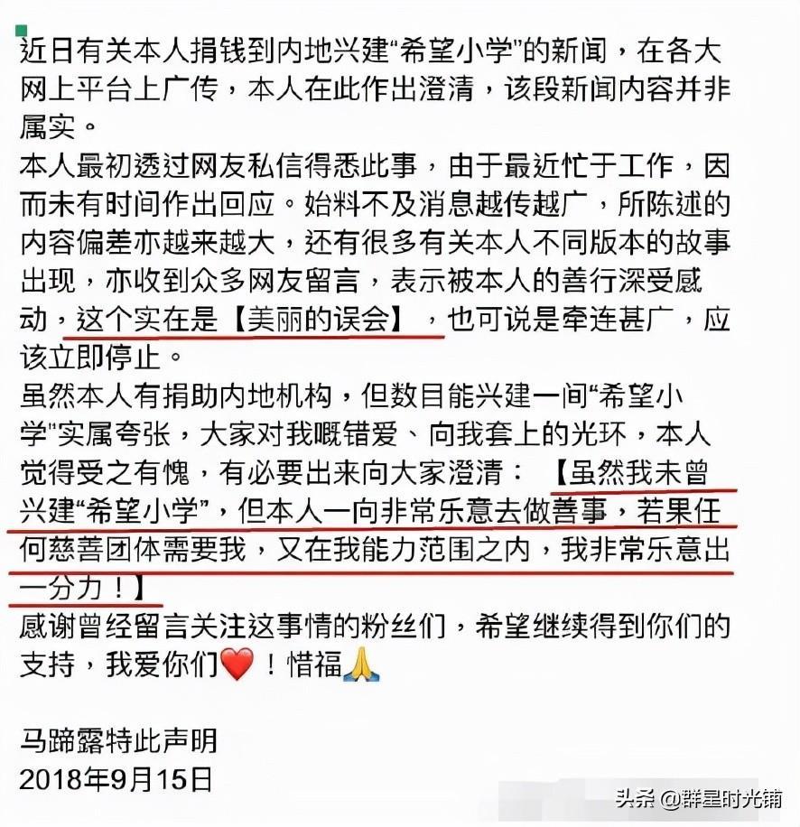 有一次媒体爆料称她在内地捐资修建了一个希望小学,