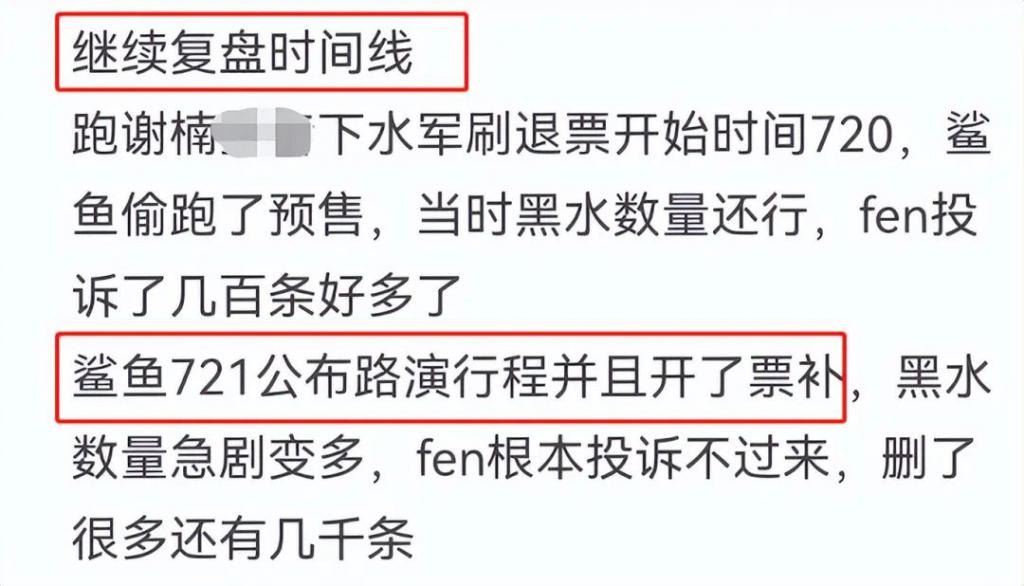 一直有吴京粉丝帮忙谢楠投诉恶意攻击,《巨齿鲨 2》公布路演行程之前,他们一天投诉几百条,勉强能维持好谢楠账号评论区,等到《巨齿鲨 2》彻底展开宣传计划,谢楠账号立马遭到了更猛烈的攻击,粉丝根本投诉不过来,删除了一批还有几千条。