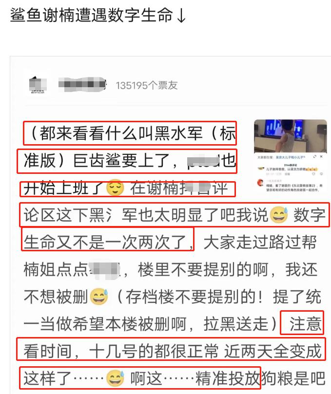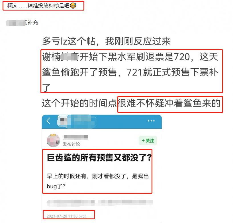 根据网友分析,7 月 20 日前后,谢楠账号评论区开始有了大量攻击性留言,也正是这个时间段,吴京主演的电影《巨齿鲨 2》开启了预售试水。