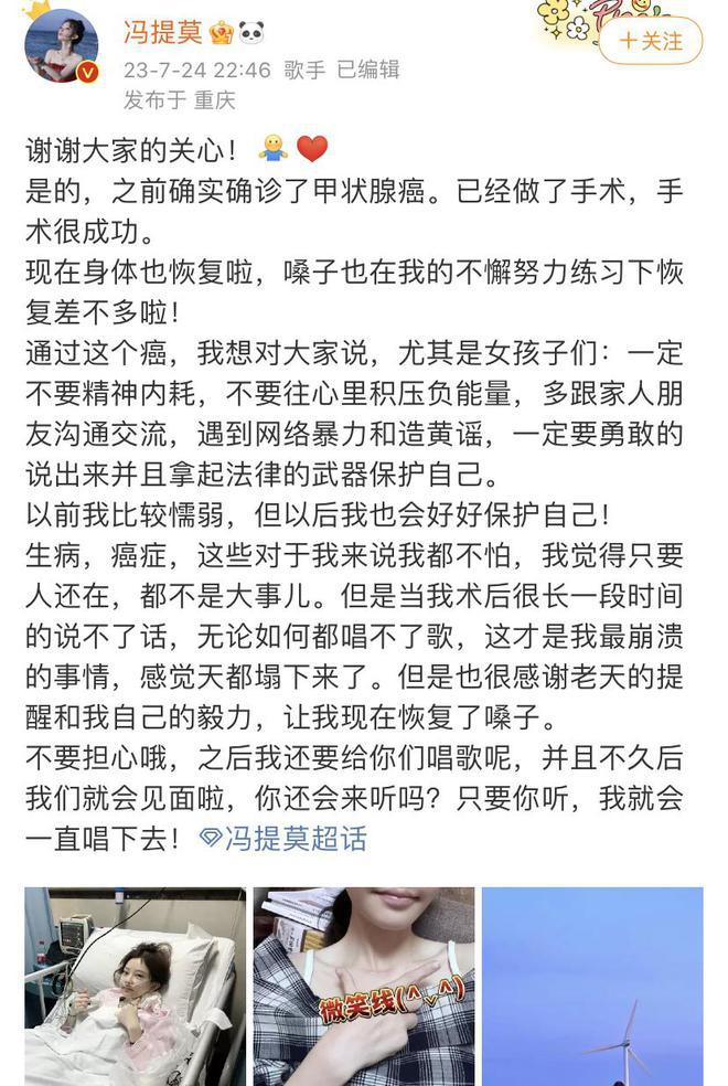 对于因病登上热搜,冯提莫也于 24 日深夜透过社交平台作出回应,她感谢大家的关心,并表示手术非常成功,现在身体已经恢复,嗓子也已经恢复得差不多了。
