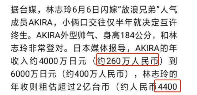 很多人以为按照林志玲的条件,一定会嫁给一位大富翁,可事实上,林志玲老公的收入远不及她。Arika 的年收入仅有 260 万,仅有林志玲年收入的 20 分之一。