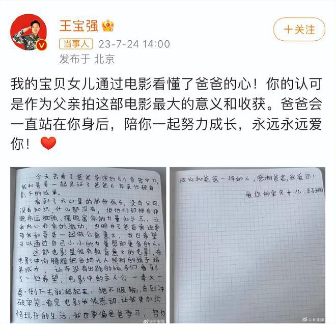 自己的作品获得了女儿和儿子的认可,女儿还亲自写鼓励信给爸爸,王宝强在个人账号晒出来,内心里一定非常幸福吧。