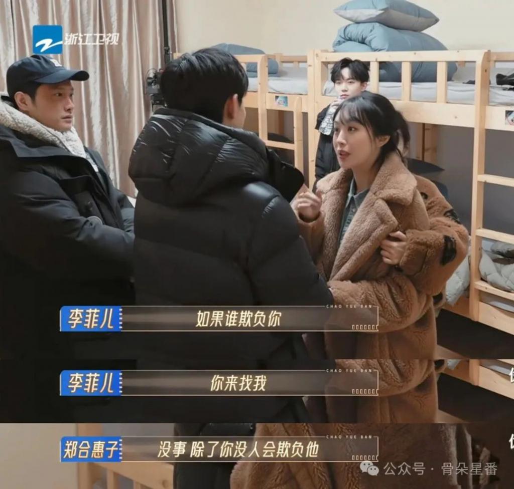郑合惠子虽然不是导师,却也在竞演综艺里当了一回判官。李菲儿和锦超因为怎么当队长在片场争执了起来,锦超觉得自己可以多付出一些,李菲儿认为队长要规划好全队的行程。最后情绪上头的李菲儿向锦超道了歉,并称:" 以后有人欺负你跟姐说。"