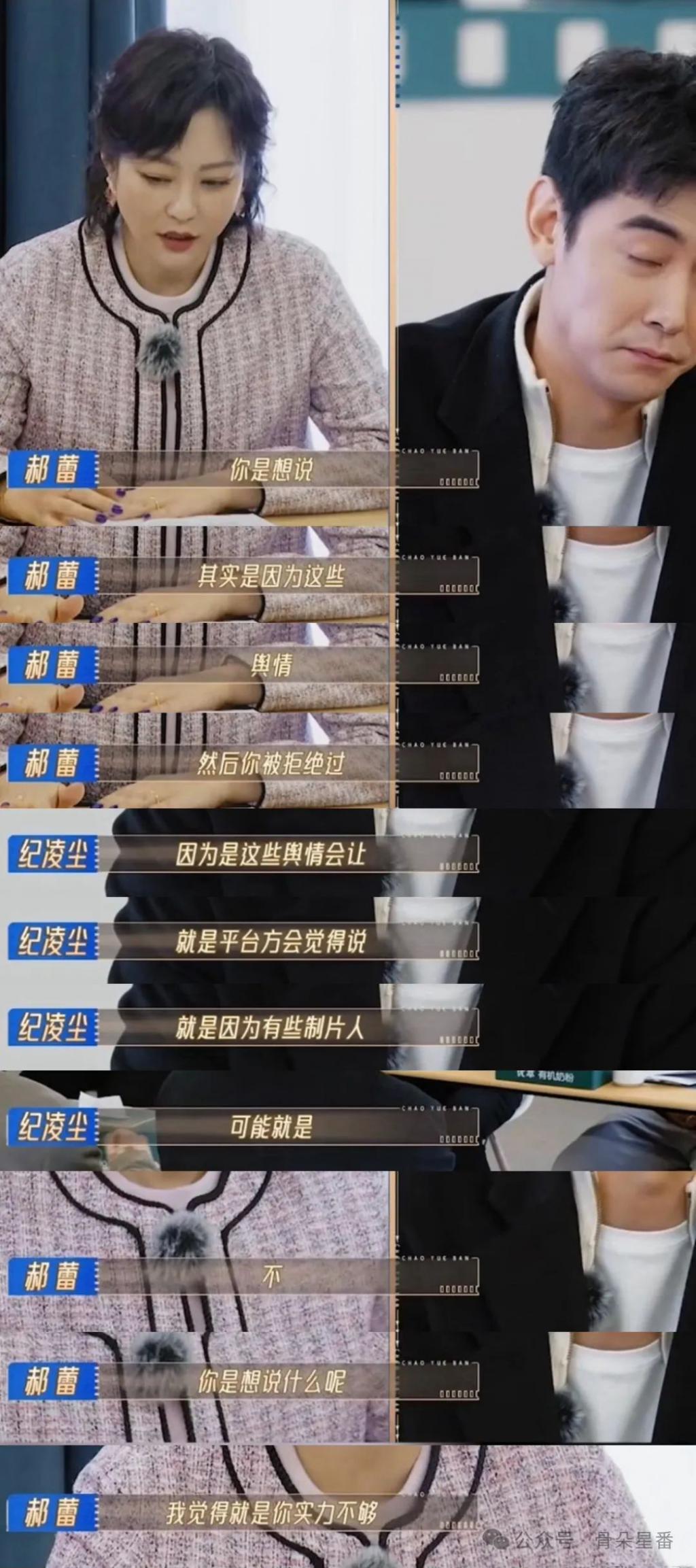 纪凌尘抱怨前女友事件导致自己五年来接戏困难,郝蕾回答:" 我觉得就是你实力不够。" 王锵想要演古装,郝蕾指出:" 你就是站着说话不腰疼,明明长着一张电影脸,非要往另一个堆子里面扎,是羡慕演古偶的粉丝多吗?" 王梓薇哭诉曾被剧组换角,为此十分自卑,郝蕾却灵魂三连问:" 如果我告诉你,是的,就是不够漂亮、不够有流量、不够有演技,然后呢?"