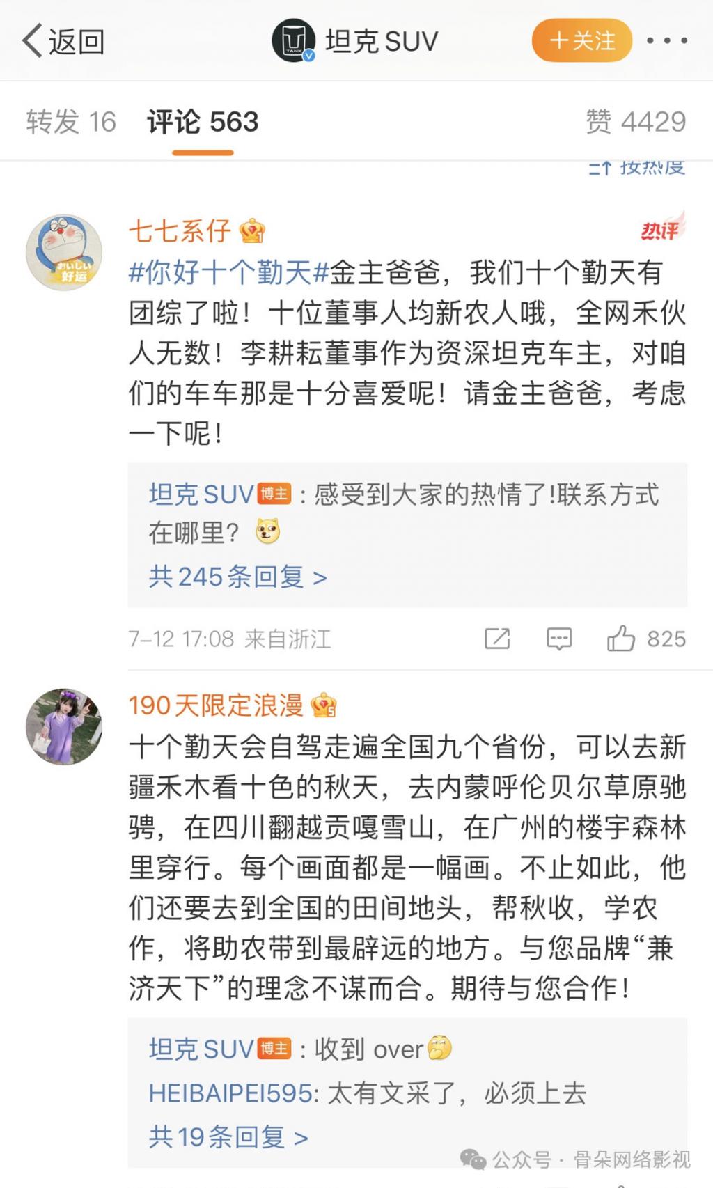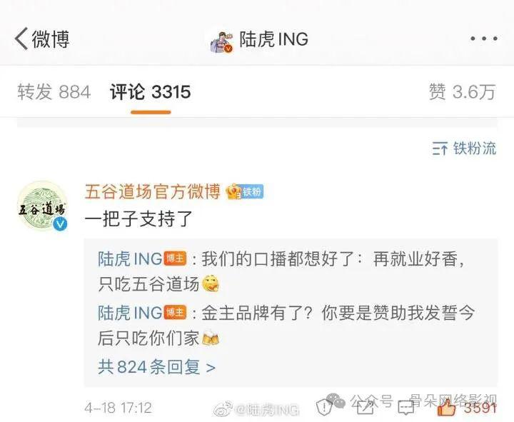" 我记得那条微博发出来没一会,五谷道场的官微就来评论虎子了。群里的粉丝高兴坏了,知道团综大概率要成,就又去五谷道场的官微评论区团建,谢谢五谷道场的慷慨相助。"