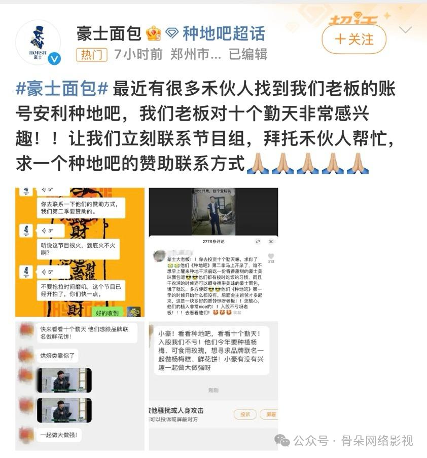 在 # 粉丝真的给种地吧拉来了赞助 # 等热搜话题下,还有品牌主动向禾伙人抛出橄榄枝,反向寻求赞助《种地吧》的机会。