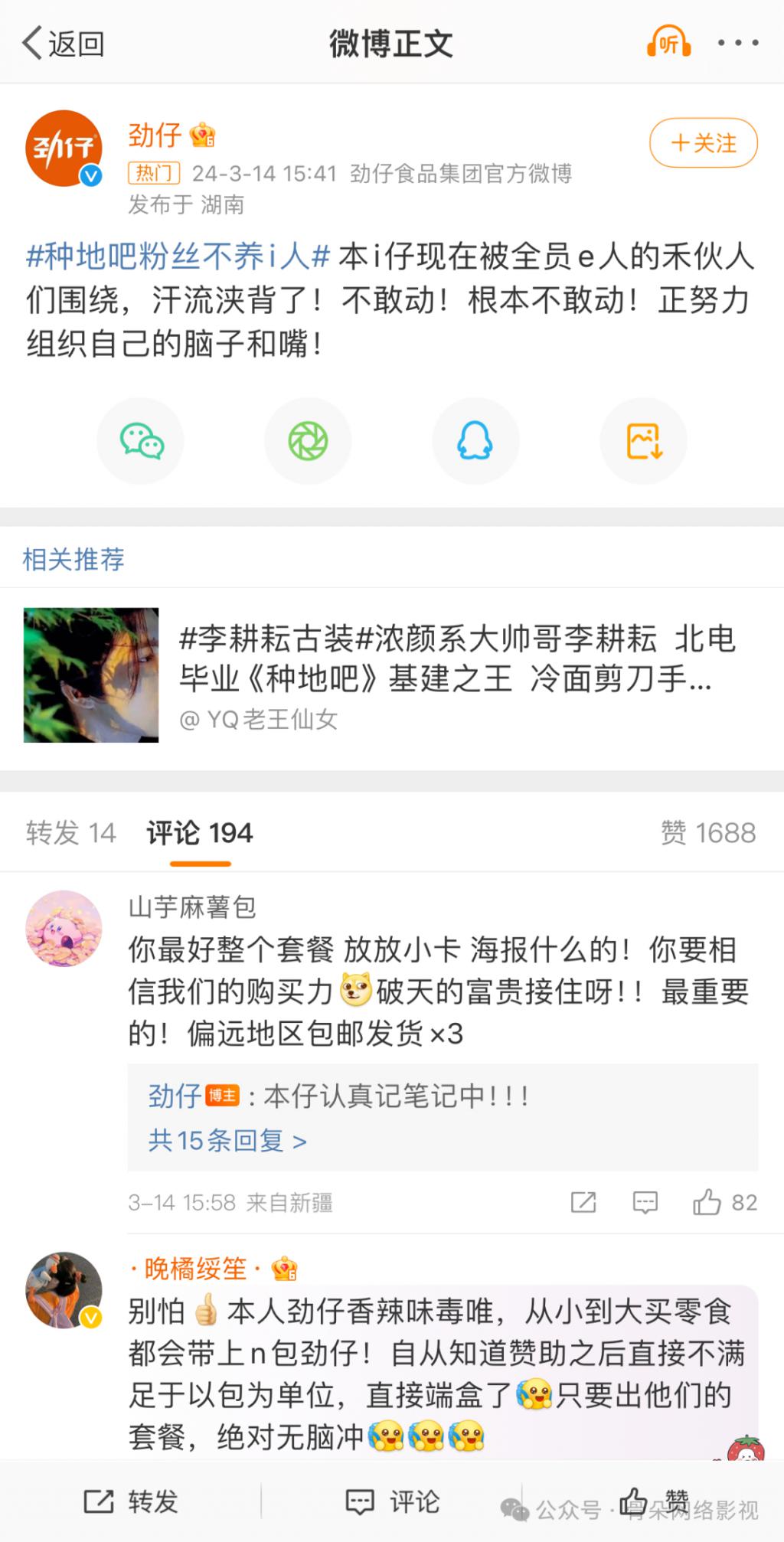 还有《种地吧》第二季的赞助商劲仔,从未针对 " 赞助《种地吧》" 这件事进行大肆宣传。但《种地吧》的粉丝在片尾的贴片发现这位老实本分的 " 金主爸爸 " 后,反而主动为其创造出了 # 种地吧粉丝不养 i 人 # 等热搜话题," 种地圈知名哑巴金主,kuku 花钱但闷不吭声,你真的我哭死!"