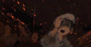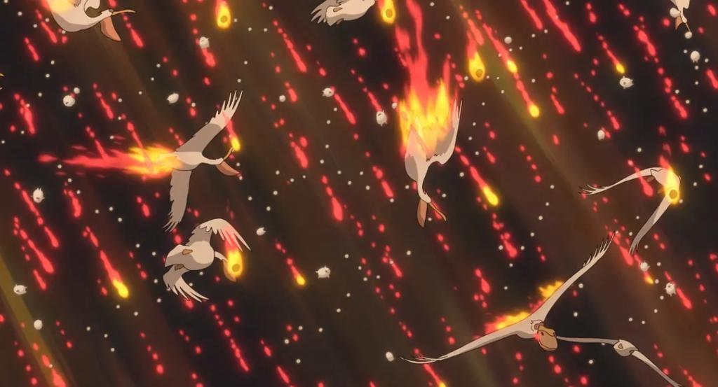 宫崎骏将这场戏处理得极富残酷感,街头战火纷飞,如同炼狱,真人狂奔,周围的人表情惊惧,像是幽灵。