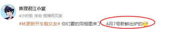 可据江小宴称,他们拍到林更新带女友出去玩,是4月7号,就是最近的新照片。