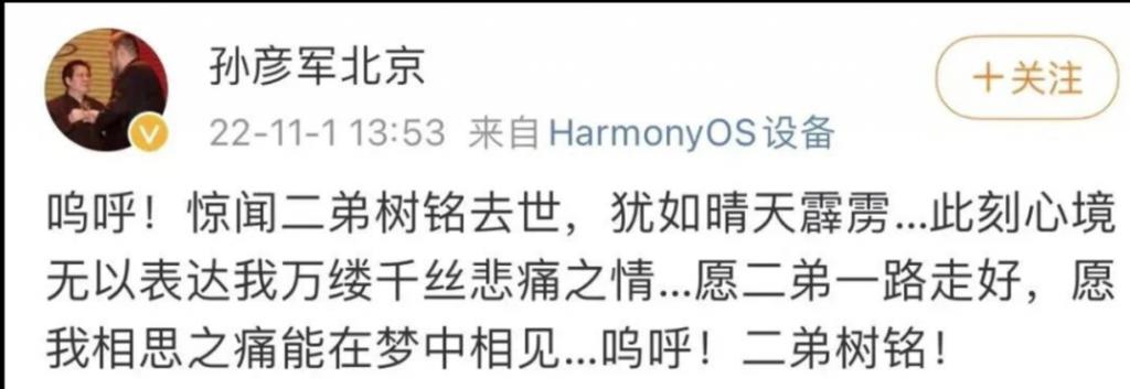 陆树铭去世后,孙彦军发博写道 " 愿我相思之痛能在梦中相见 "。