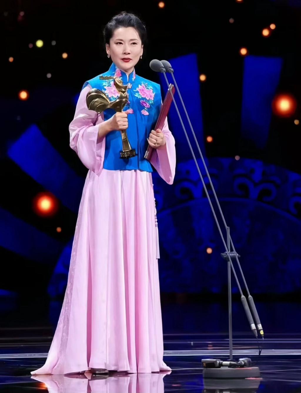 拿下影后桂冠的她,穿着一件天蓝色马褂,上面绣有粉色花朵,搭配一件同色系的粉色长袍,还有中式盘发,一副将新中式贯彻到底的气势。