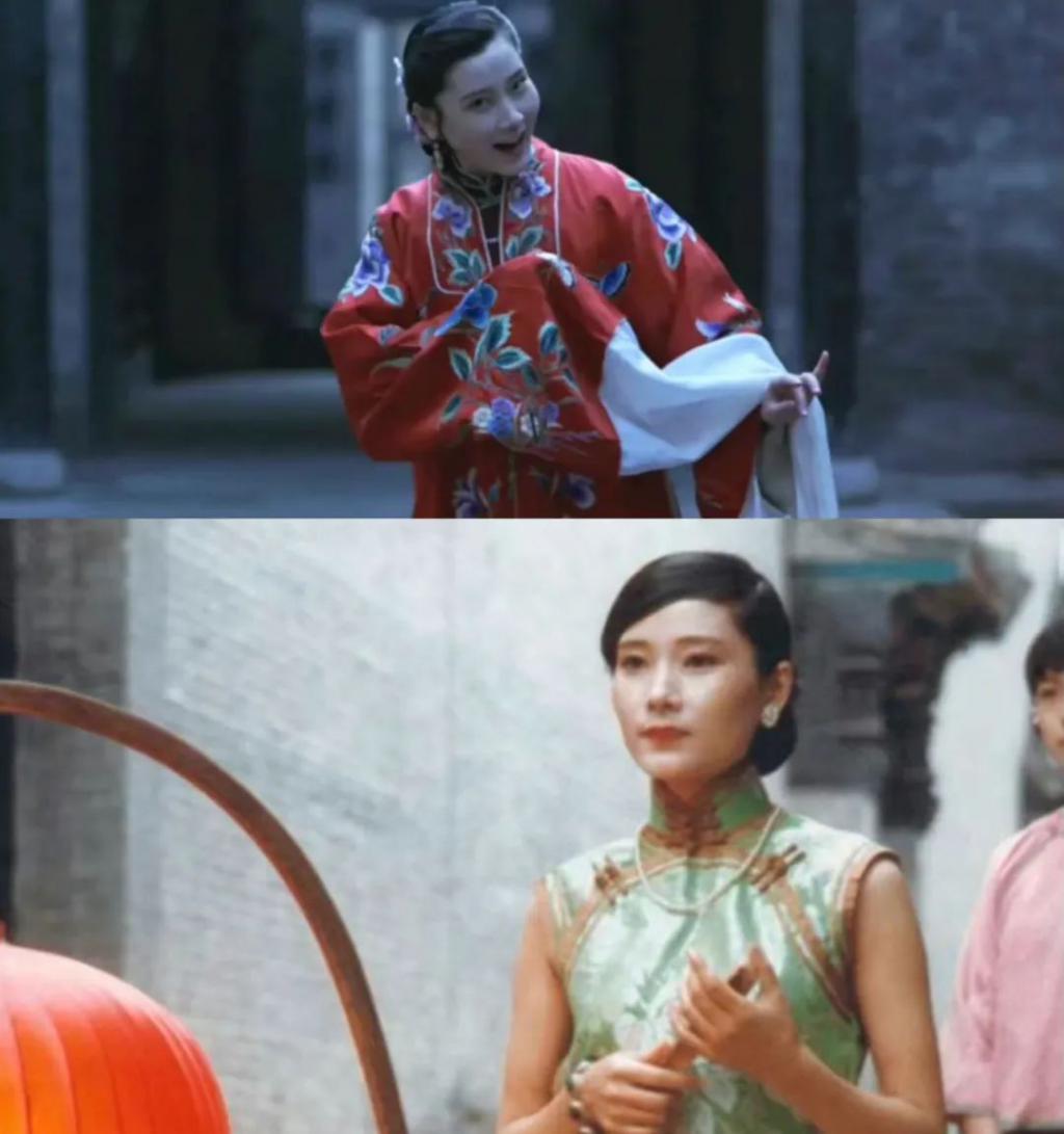 前者里,她是妩媚娇俏的三姨太梅珊,爱穿红着绿,一身捂不住的风情;到了后者,她成了寂寞疯癫的秀仪,一身中式黑色薄纱长袍,盘发下是一堆翡翠绿耳环,落泪时宛如一幅易碎的画,更添岁月沉稳风韵。