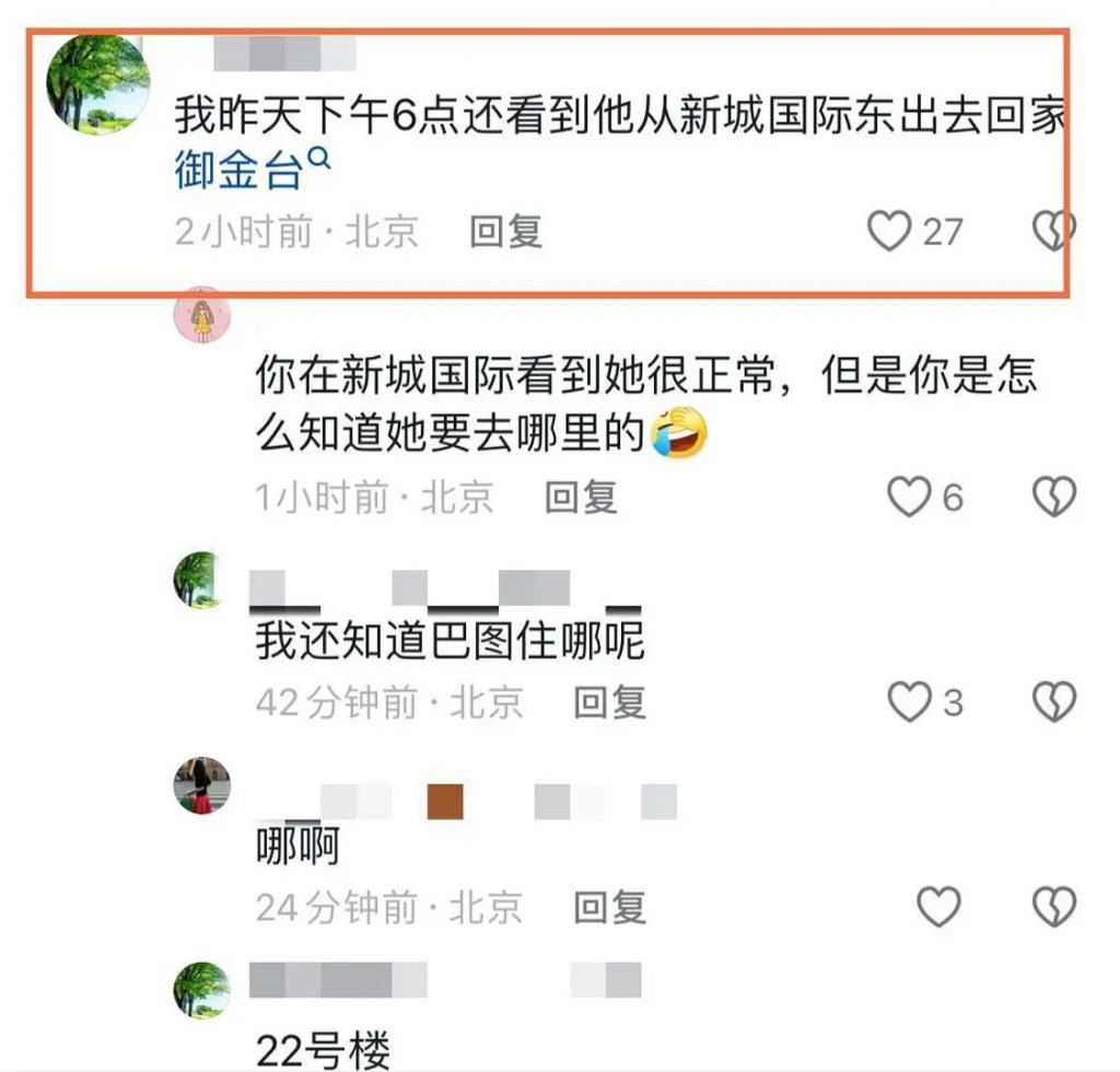随后也有网友证实了这个消息,表示自己上次在御金台门口看见宋丹丹从新城国际东门进去了。
