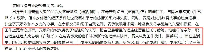 简单概括,剧版讲的是上海 29 岁普通乖乖女麦承欢(杨紫 饰)因妈妈(何赛飞 饰)催促,和恋爱三年的男友辛家亮(牛骏峰 饰)开始议婚。