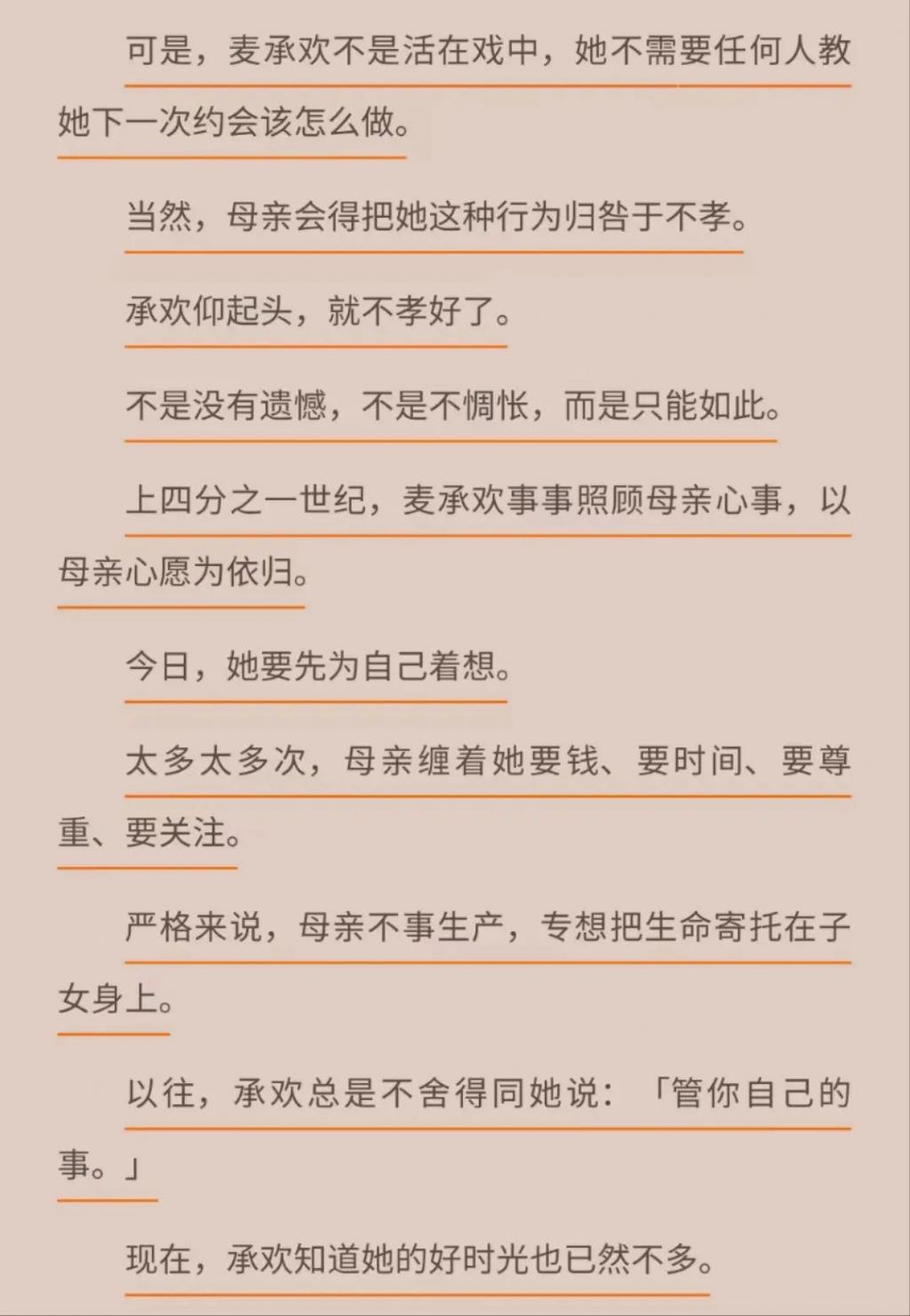 原著麦承欢从家中搬出,母亲开始念叨她回家吃饭时,她开始光明正大地表达不想去,如果这是不孝,那就不孝好了。
