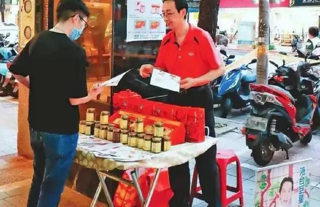 一位老人在街头摆摊兜售自家制作的干贝酱,旁边立着一块形象牌。