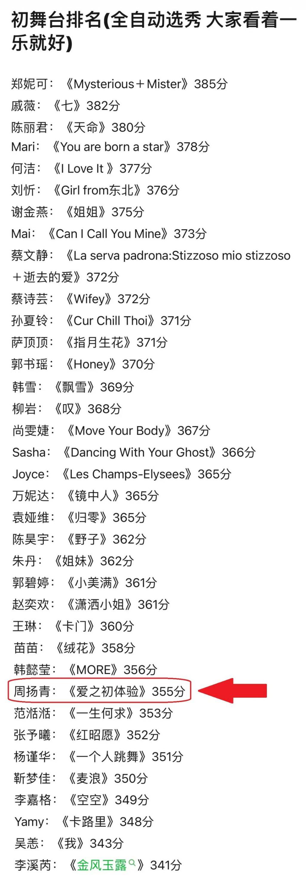 周扬青想要传达的情感态度是正能量的,但她作为参加竞演节目的嘉宾,实力却如此拉胯—— 36 位姐姐的初舞台排名,她倒数第九。