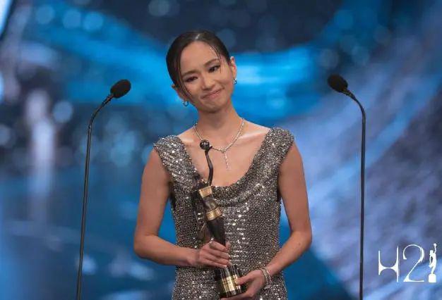 一直被网友调侃多年无作品的刘嘉玲,身穿一袭银白色抹胸长裙亮相红毯,快 60 岁的她依旧气场全开,大方走上颁奖台替老公梁朝伟领奖。