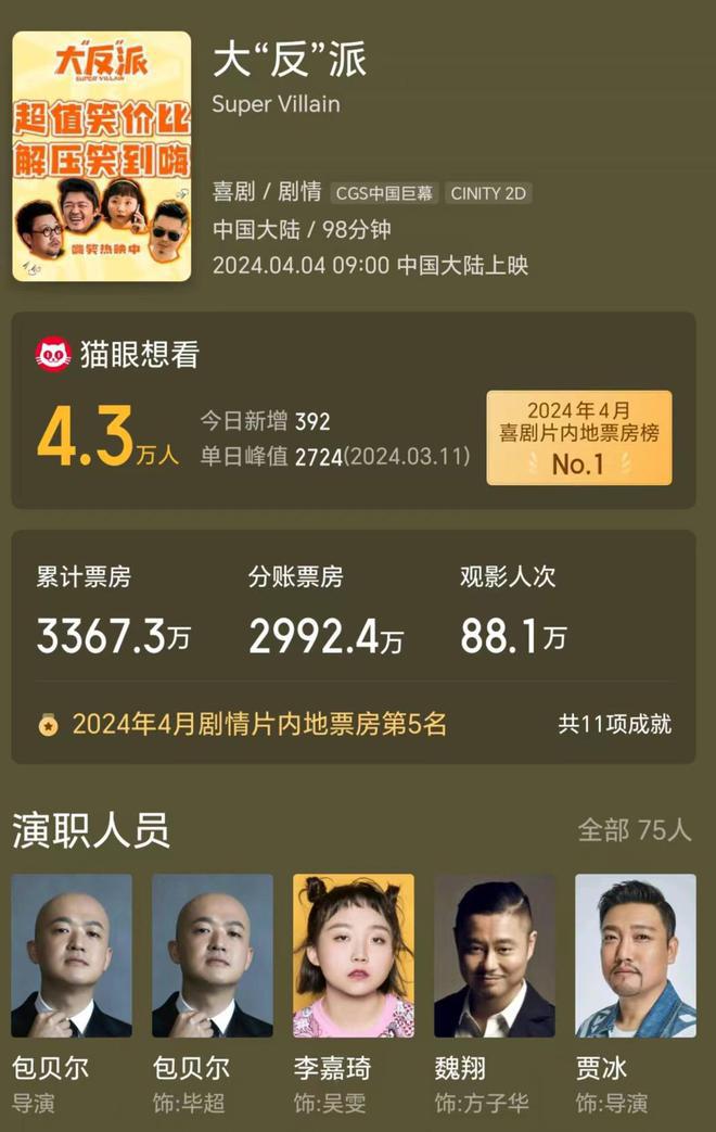 4 月 4 日,《大 " 反 " 派》上映,目前票房 3367 万;