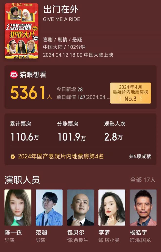 4 月 12 日,《出门在外》上映,目前票房 110 万;