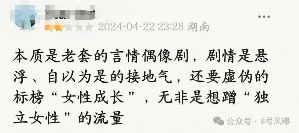 有网友指出这部剧本质是老套的言情偶像剧,剧情非常悬浮,标榜的 " 女性成长 " 标签,在剧里非常虚假,说到底其实还是想蹭 " 独立女性 " 的流量。