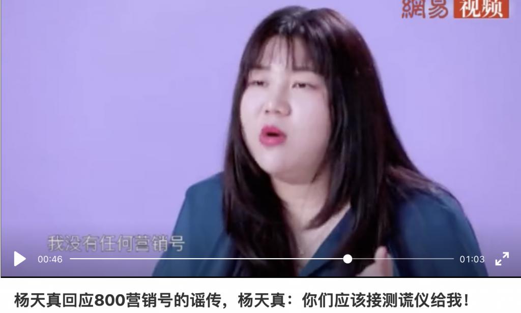 杨天真,毕竟这是坊间流传手握 800 个营销号的女人啊。虽然她后来辟谣了,但还是有很多人深信不疑。