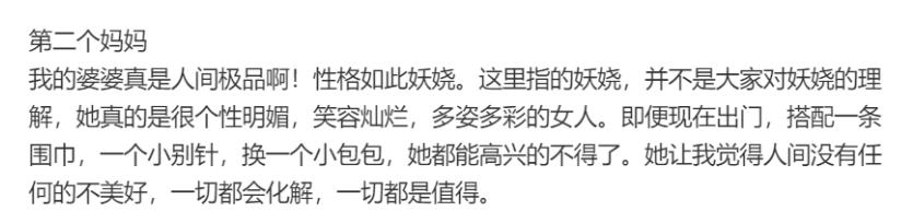 她写人生中的三个妈妈,视自己的婆婆为第二个妈妈,毫不掩饰自己对妈妈的爱: