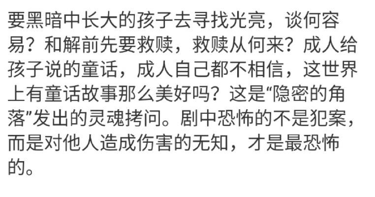 而《隐秘的角落》则是 " 让我们看见地狱无边,所以才有寻找天堂的力量。"