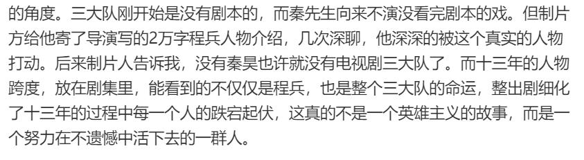 到了《三大队》,又将文字的重点放在 " 向来不演没看完剧本的戏 " 的秦昊,是如何被这一角色所吸引的。