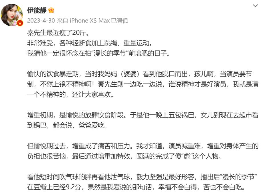 《漫长的季节》爆火时,秦昊甚少出来讲述自己为这部剧付出了什么,都是伊能静在微博里透露出他在拍摄时的点点滴滴。