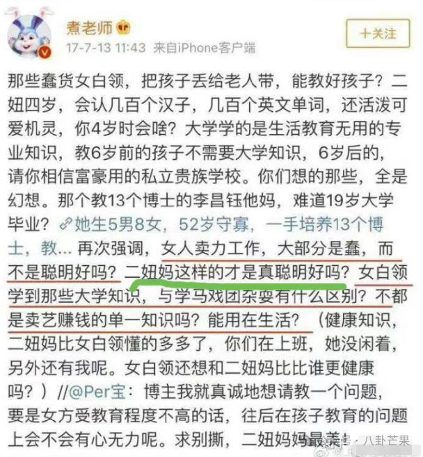 徐波喜欢用二妞妈作为例子来嘲讽认真在学业和职场拼搏的女性。他说二妞妈这样,爱生娃,爱带娃,温顺伺候好孩子和男人的,才是聪明女人。