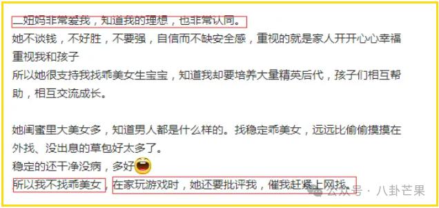徐波说,二妞妈不但温柔贤淑,而且很大度,非常支持他的 " 鸿鹄之志 ",支持他纳妾生娃,帮他打理孩子,跟他的女朋友们也相处融洽。重点是,二妞妈还不谈钱,对他是真爱。