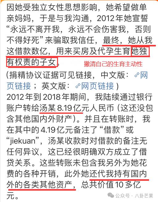 他陆续转了 8 亿多去国外女方名下,其中 4.19 亿备注借款,后来女方还了 5 亿,所以他现在追讨的是 3 亿。(所以啊,备注借款的那部分,不是已经还了吗?)