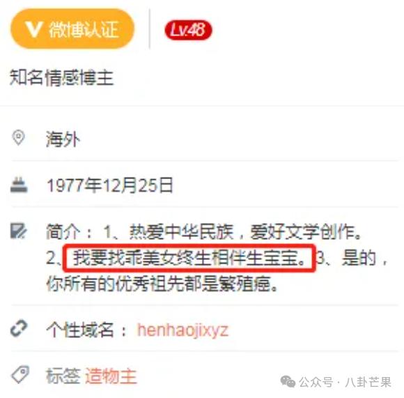 他对繁殖有疯狂执念,而且是付诸行动,在网上直言寻找 " 乖美女 " 生孩子。