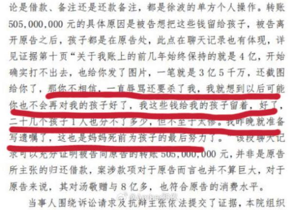 汤女士的卡里常年趴着几个亿,她真的没动。发生矛盾了,徐波吓一吓她,她就还了 5 亿,当时孩子们在徐波那里,汤女士的意思是把这 5 亿给孩子。至于那 3 亿,她也想转账的,但是转账不成功,被徐波辱骂,还威胁杀她,她心态崩了,觉得徐波也不会对孩子好(这才觉得呢!?),她要自己为孩子努力。