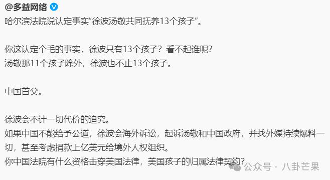 徐波为了在官司里进一步撇清自己对这些孩子的责任,在檄文里写【是女方自己想当单亲妈妈才造出了那些孩子】。哈哈,他自己信吗?一个女的,为了想当单亲妈妈,造出 13 个他徐波基因的孩子?这事分明就是,他派女方去美国帮他打理 " 生娃大业 ",管理代孕的大小事宜,兼职转移资产。