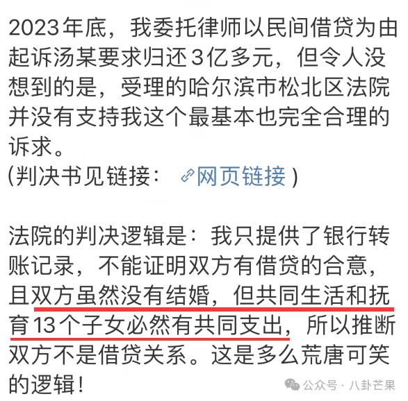 自称 " 中国首父 " 的徐波,现在发飙是因为他向汤女士追讨 3 亿,被判败诉,法院的主要事实依据是他们共同抚养 13 名子女,必然有共同支出,不承认他们的借贷关系。